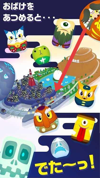 3、在场景互动界面,按照“おはけを-あつめると(收集妖怪)”的提示,点击箭头指向的区域,收集妖怪等元素,触发“でた~ん!(出现啦!)”的效果,推进游戏进程。