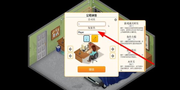 2、信息设置跳转公司详情配置页,填公司名、玩家专属昵称,查看难度时长、角色初始专精,确认后点继续,精准完成初始设定。