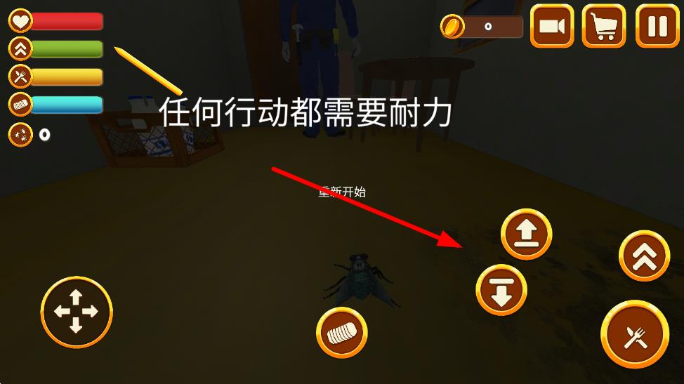 1、进入局内后操控苍蝇在房间飞行,避开人类视线与苍蝇拍攻击,寻找蛋糕、水果等食物补充能量。