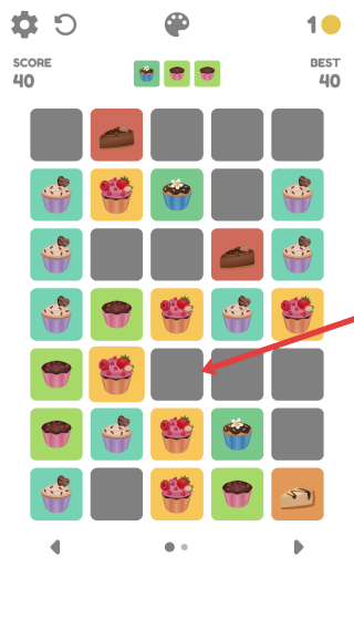 1、在消除界面,点击箭头指向的空位周边同类型蛋糕,使其移动、完成三消,获取分数(当前SCORE-40)。