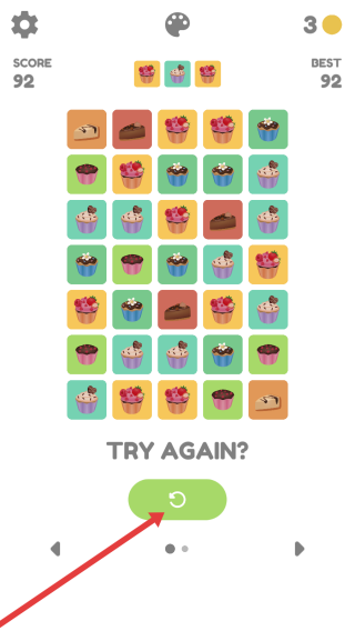 2、结算界面,若分数未达预期,点击“TRY-AGAIN?”下方的重置按钮(箭头指向),重新开始本关挑战。