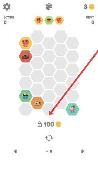 3、新关卡解锁时,花费100金币(箭头指向),开启六边形网格新布局,继续消除游戏。