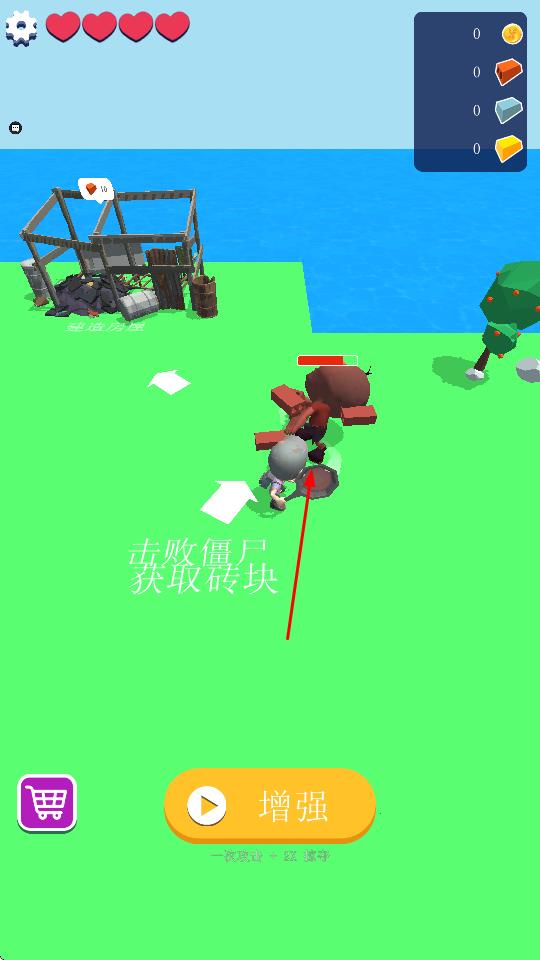 1、“击败僵尸”,操控角色,攻击僵尸,获取建筑材料(砖块),积累资源。