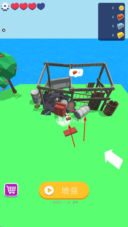 2、“收集资源”,探索场景(房屋废墟、树木),收集金币、砖石等资源,用于建造。