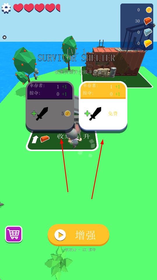 3、“建造升级”,用砖块建造房屋,升级庇护所,提升幸存者数量、掠夺能力,增强生存实力。