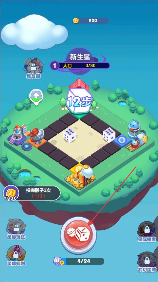 2、在“新生星”场景,点击底部骰子按钮,投掷骰子,根据点数移动棋子,触发场景事件,获取资源。
