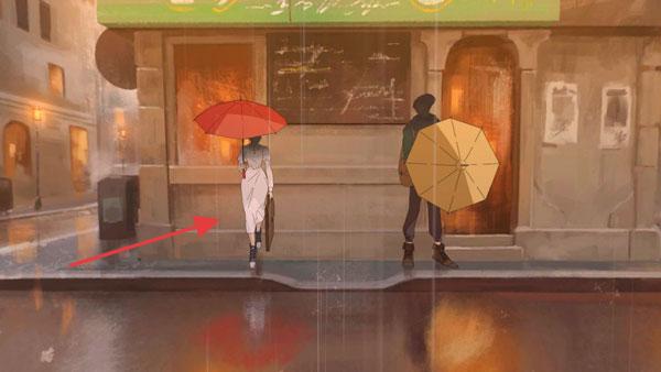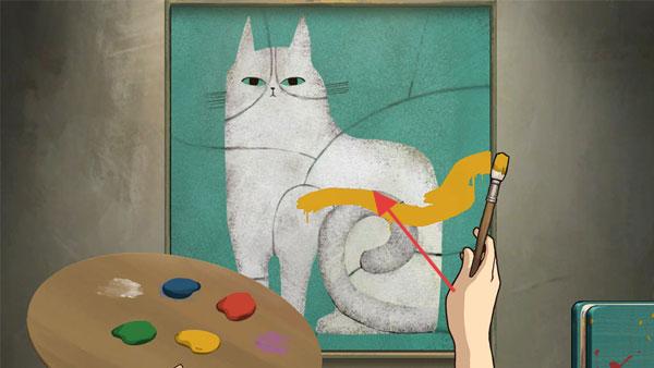 2、在绘画场景,跟随箭头指引,用画笔为猫咪画作填充颜色(黄色区域),修复画作,推进故事发展。