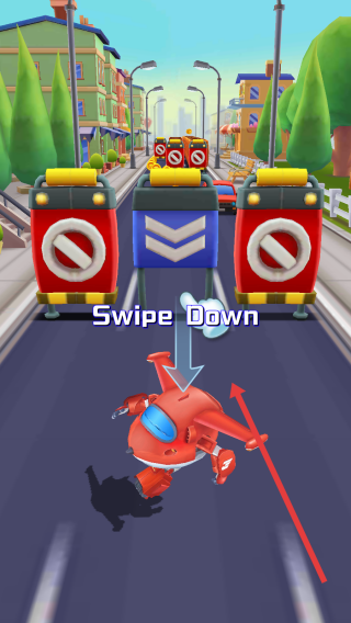 3、跑酷时,按“SWIPE-DOWN”提示(箭头指向操作),向下滑动屏幕,让乐迪做出滑行动作,躲避障碍,继续奔跑。