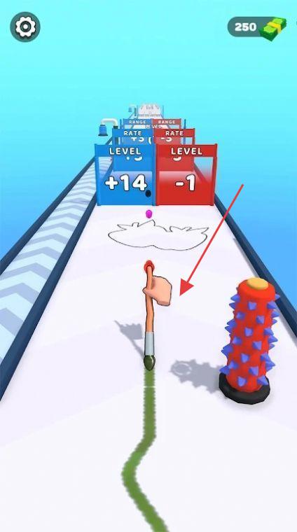 2、在进阶关卡中,应对更复杂的跑道地形和多样障碍物,边跑酷边收集颜料,解锁更多绘画工具,绘制更复杂的物件,积累分数提升排名。