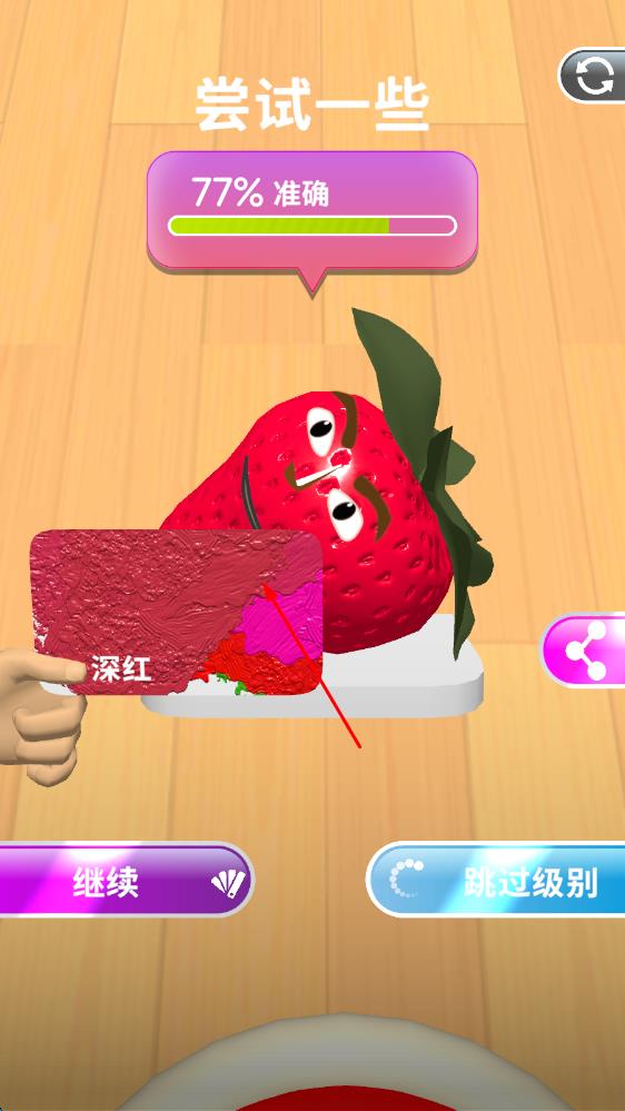 2、调色过程中,根据颜色差异调整颜料比例,逐步接近目标色,完成后将颜色应用到图案上,通过关卡检验进入下一挑战。