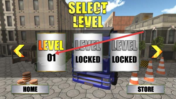 2、选关界面,通过点击“LEVEL-01”(箭头指向),进入第一关,开始卡车运输任务。