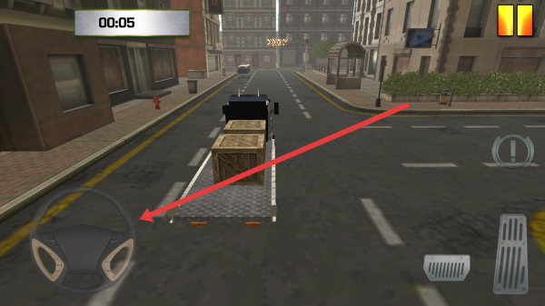 3、驾驶阶段,通过左侧虚拟方向盘(箭头指向)控制卡车方向,在道路上行驶,完成运输挑战,注意时间限制(00:05)。