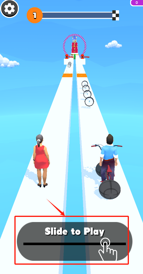1、观察蓝天背景下的跑道上,红裙女性与骑车男性的角色组合,点击下方的“Slide to Play”按钮,即可开始游戏,开启双人骑行的冒险之旅。