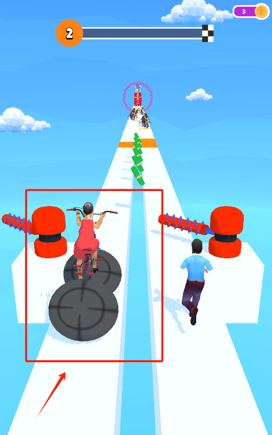 2、骑车经过绿色和橙色方块等路面时,要注意躲开红色尖刺夹子等障碍物,屏幕左上角的数字“2”提示当前所处的关卡,时刻关注关卡进度与障碍分布。