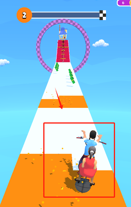 3、操控红框标注的男女角色骑行通过紫色圆环关卡,右上角的数字“2”显示当前的完成进度,确保两人配合通过所有圆环,推进关卡进程。