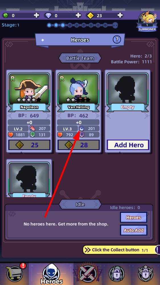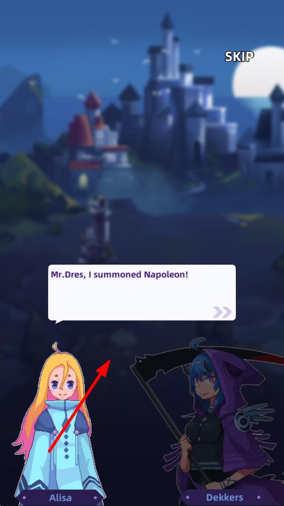 2、挂机场景中派遣阵容自动战斗,收集金币与灵魂碎片,使用资源提升角色等级与技能等级。