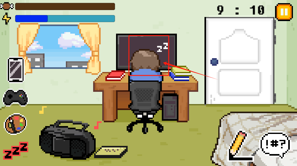 2、控制角色在9:10前完成目标,红框中的电脑是重点操作对象,书本可以用来掩护玩游戏的行为,避免被家长发现。