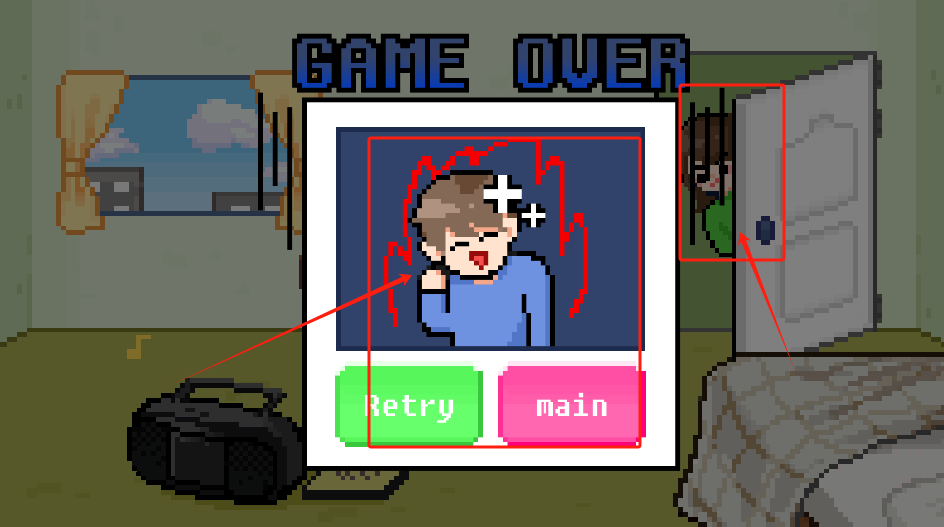 3、游戏失败后,点击“Retry”可重新开始本局游戏,点击“main”则返回主界面;要时刻注意门后,可能有人偷看,需保持警惕。