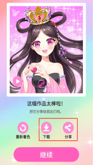 3、社交分享功能:作品可一键分享至社交平台,参与“公主配色大赛”等活动,与其他玩家交流创作心得,增强游戏互动性。