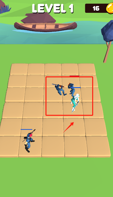 3、将红框标记的白衣小人拖到下方蓝衣小人旁边,合并队伍,做好迎战第1关敌人的准备。