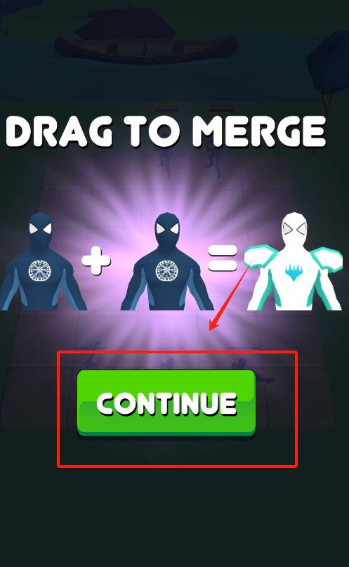 2、拖动左边两个深蓝色蜘蛛侠图标往中间合并,当合并成三个后,点击绿色“CONTINUE”按钮继续下一关。