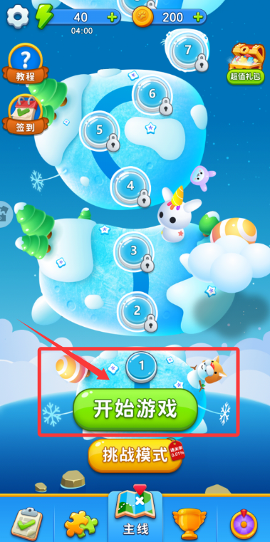 1、点击主界面的开始按钮,从可选关卡中选择第一个开放的基础难度进行挑战。