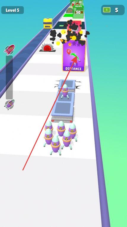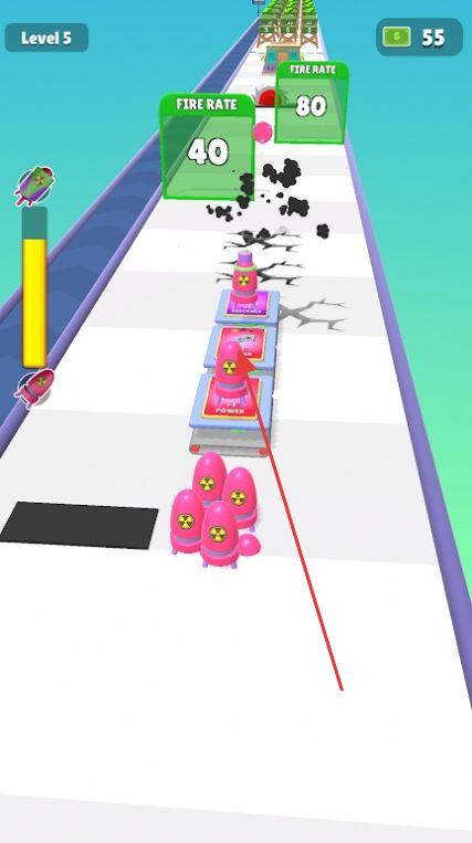 2、在进阶关卡中,面对更多数量的敌对橡皮人和跑道上的升级道具,边竞速边精准轰炸,收集道具升级导弹,解锁新的导弹类型(如跟踪导弹、子母弹),提升闯关效率。