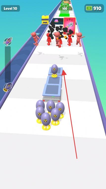 3、极简竞速跑道:采用长直跑道设计,风格简约明快,跑道上除了敌对橡皮人,还分布着加速带、道具刷新点等元素,竞速节奏清晰,让玩家专注于轰炸操作和速度提升。