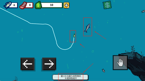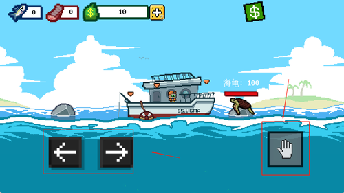 2、左侧是控制船只移动的按钮,可操控船只在海域中移动寻找合适钓点;右侧设有抛竿与收线功能键,用于完成抛竿和收线动作。