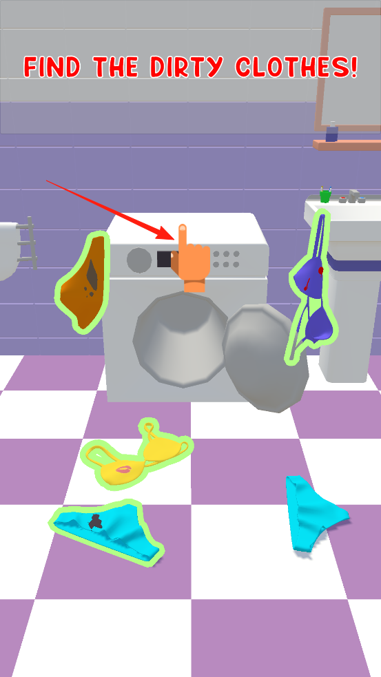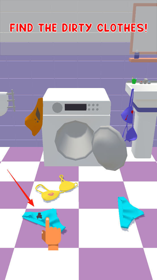 1、进入“找脏衣服”关卡,在浴室场景搜寻,点击标记脏衣服,通过污渍特征区分,开启清洁任务的第一步,体验视觉辨别与物品筛选的玩法。