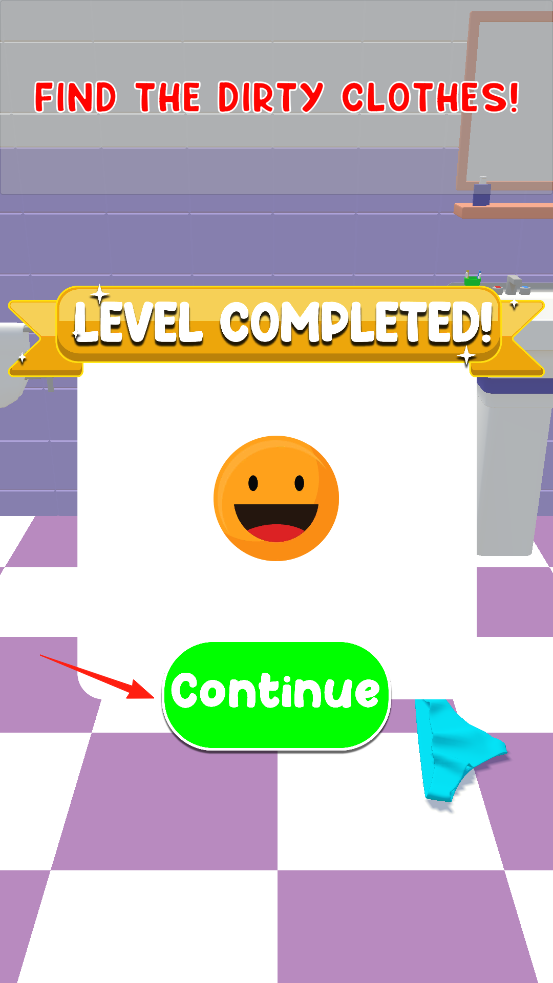 3、脏衣成功收纳、清洗后,触发“LEVEL COMPLETED”提示,点击“Continue”进入下一关,通过完成脏衣识别-收纳-清洗的完整流程,解锁新关卡。
