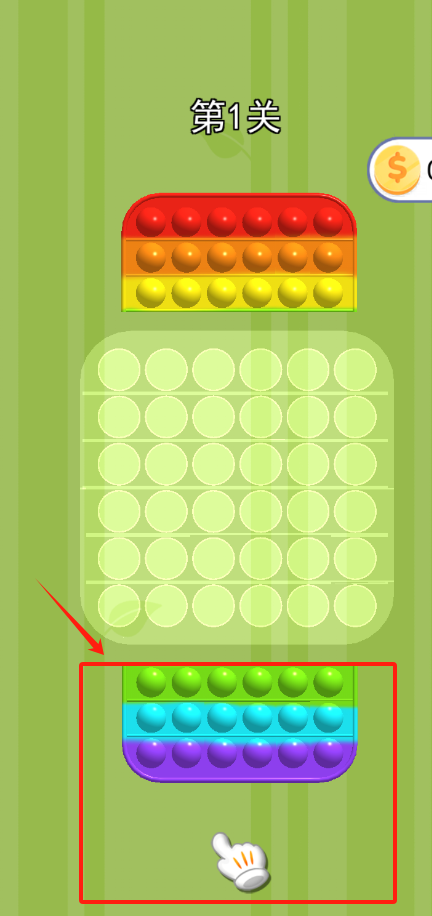 2、看准彩色渐变方块和圆点的位置,用手指拖动红框选中的玩具块,将其对准网格空缺处并放置正确,即可顺利过关。