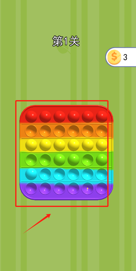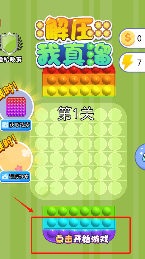 1、点击“开始游戏”进入第1关,屏幕下方有彩色按压玩具等待体验,右上角的金币和闪电道具可在需要时使用,助力轻松闯关。