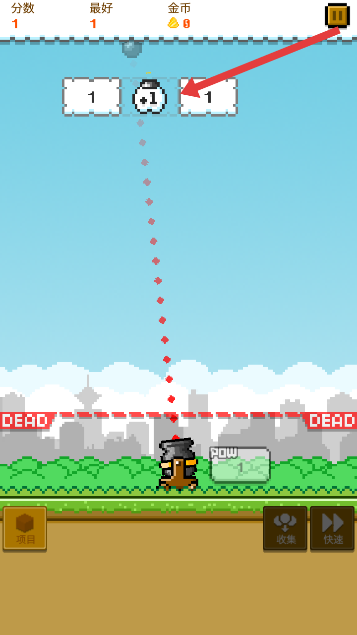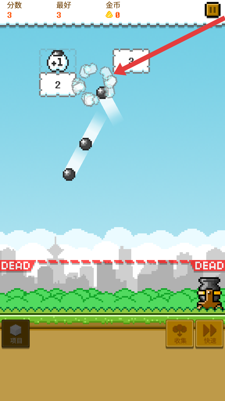 3、需要利用炮弹反弹机制,连续击碎多层的砖块,来进行积累分数,注意躲避下方“DEAD”红线区域。