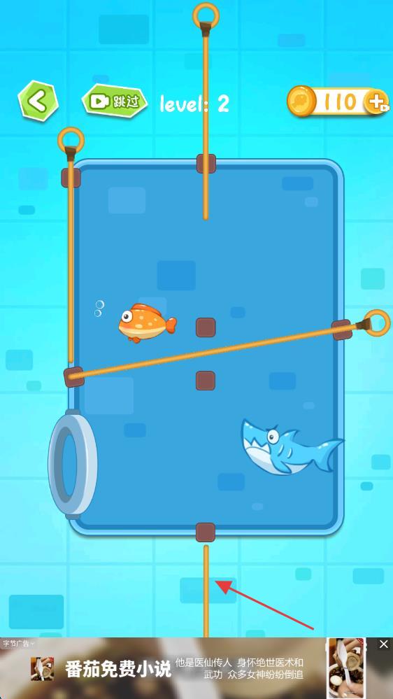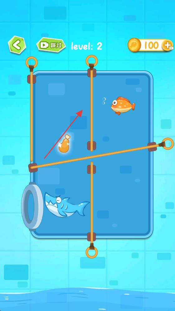 1、进入第2关,面对困住小鱼和鸡腿的绳索布局,还有鲨鱼威胁,观察绳索连接的圆环,思考剪断顺序,要让小鱼避开鲨鱼,顺利获取鸡腿。