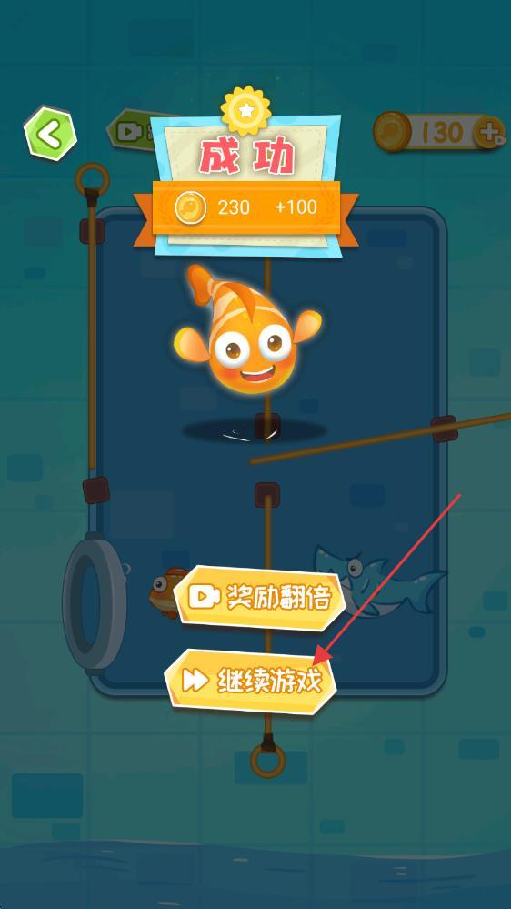 3、小鱼成功逃生,弹出“成功”界面,显示金币奖励,点击“继续游戏”进入下一关,或选“奖励翻倍”看广告获更多金币,通过完成关卡挑战,积累资源解锁新内容。