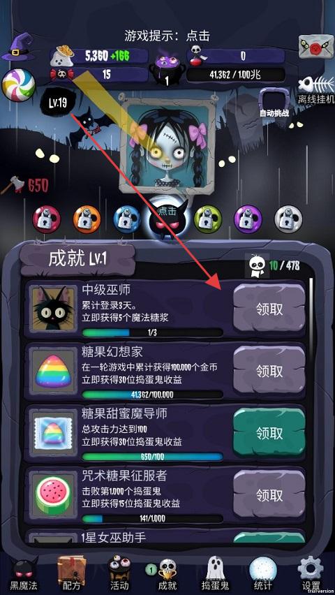 1、在“成就”界面,点击【领取】“中级巫师”奖励(累计登录3天),获取5个魔法糖浆,提升资源储备,加速游戏进度。
