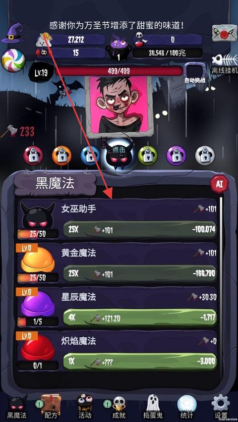 3、在“黑魔法”界面,升级“女巫助手”(消耗资源),提升其攻击力倍数(25X),强化主力输出,高效击败捣蛋鬼,推进关卡。