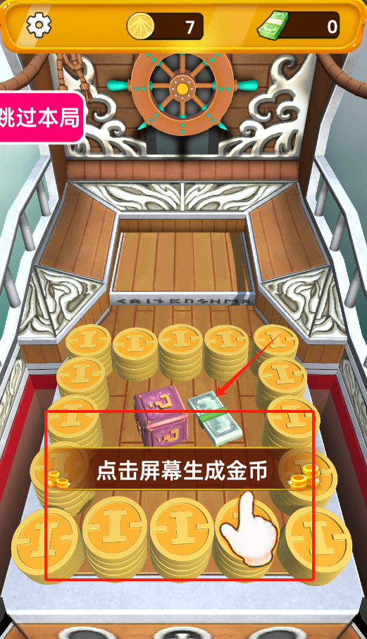 3、狂点屏幕可疯狂制造金币,堆成山的钱和箱子可以随意获取;若不想玩本局,点击“跳过”按钮即可跳过当前环节。