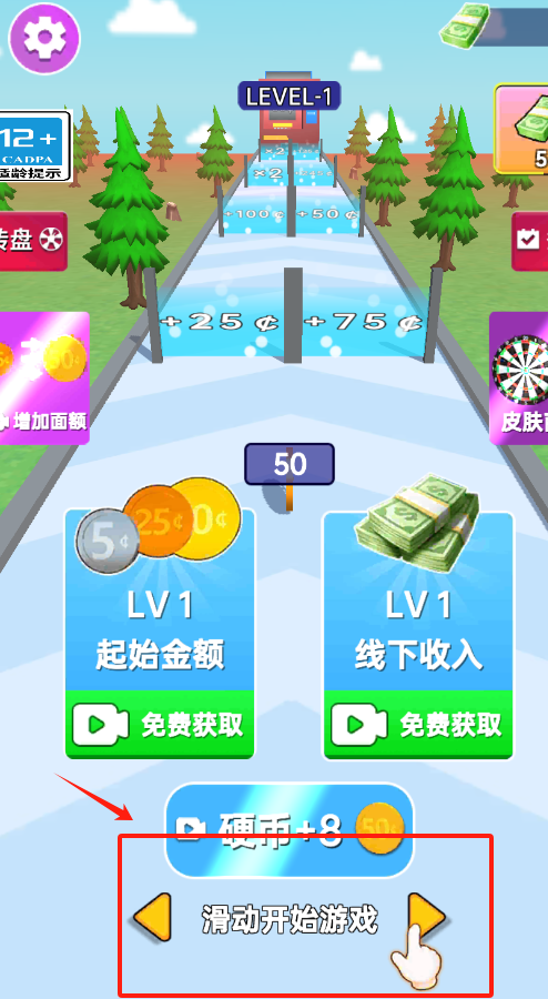 1、点击滑动开始游戏,控制金币顺着道路奔跑,途中收集金币;选择“免费获取”可升级皮肤和收入,初始从50金币起步,逐步积累财富。