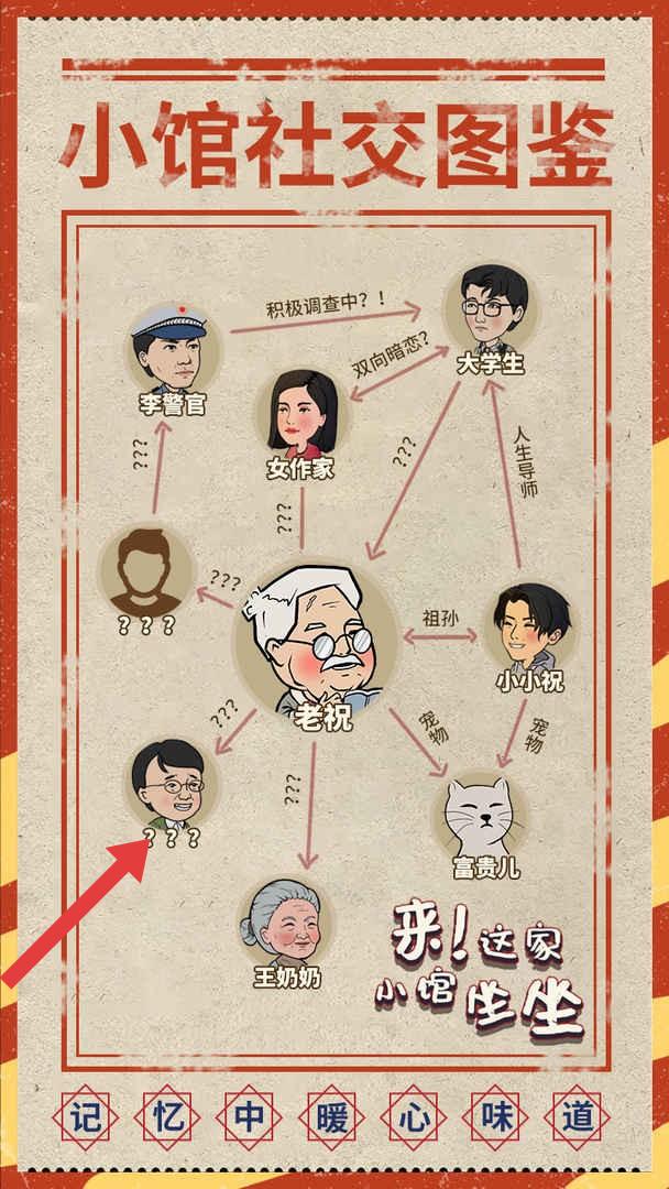 1、查看“小馆社交图鉴”,梳理人物关系(如老祝与小小祝是祖孙),根据???标记,推测隐藏关联(比如女作家和大学生的双向暗恋)。