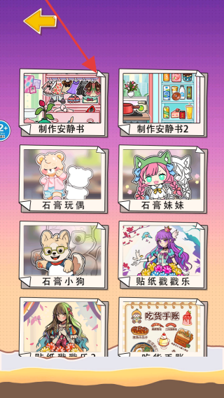2、选择“制作安静书”(箭头指向),进入手工制作流程,按步骤完成安静书创作,解锁新玩法(如石膏玩偶、贴纸)。