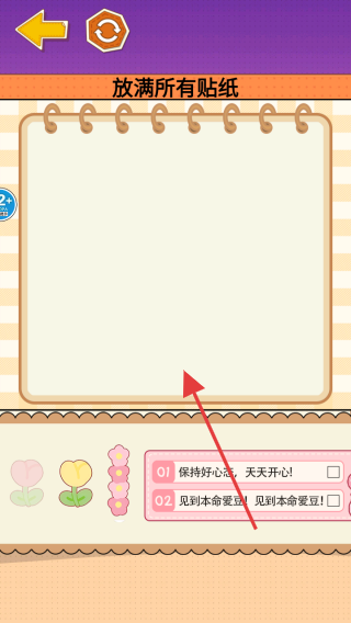 3、在“放满所有贴纸”任务中,点击箭头指向的空白页,选择下方贴纸(如“保持好心态”),拖动至页面,完成贴纸收集,达成关卡目标。