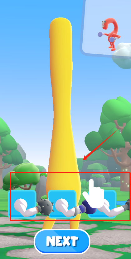 2、点击蓝色方块触发机关,红小人在云上观察,完成操作后点击“NEXT”进入下一环节。