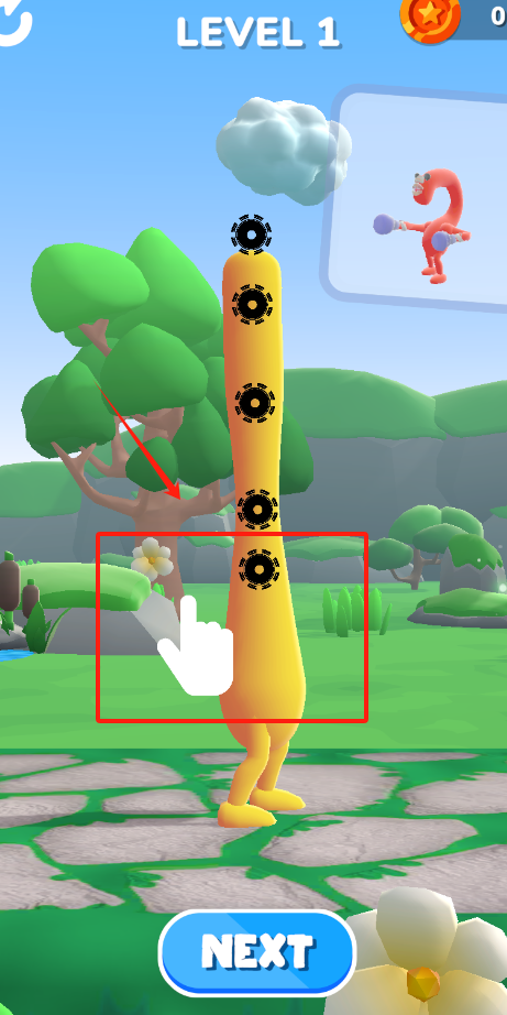 1、点击手形指示的黑点开始第一关,右上角有红色对手等待,无需畏惧,点击蓝色“NEXT”按钮继续游戏。