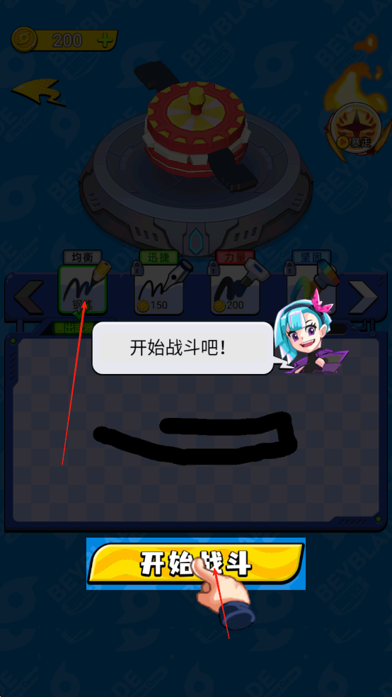 1、进入游戏后选择英雄,通过绘制图案生成专属陀螺,匹配对手进入竞技场,操控陀螺移动与对手展开碰撞,利用旋转力量压制对方。