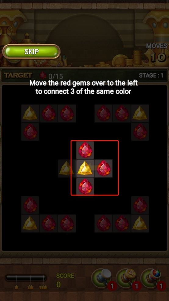 2、关卡中珠宝排列有序,尝试交换相邻珠宝,让三颗及以上同色珠宝相连,就能欣赏到它们消除时的酷炫效果。