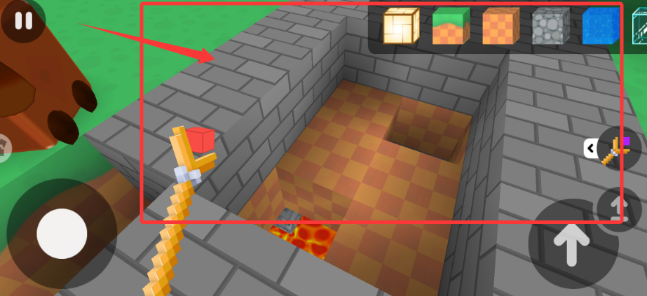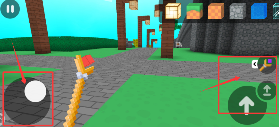 2、左手操控虚拟摇杆移动角色,右手点击功能按钮实现跳跃、放置等基础操作指令。