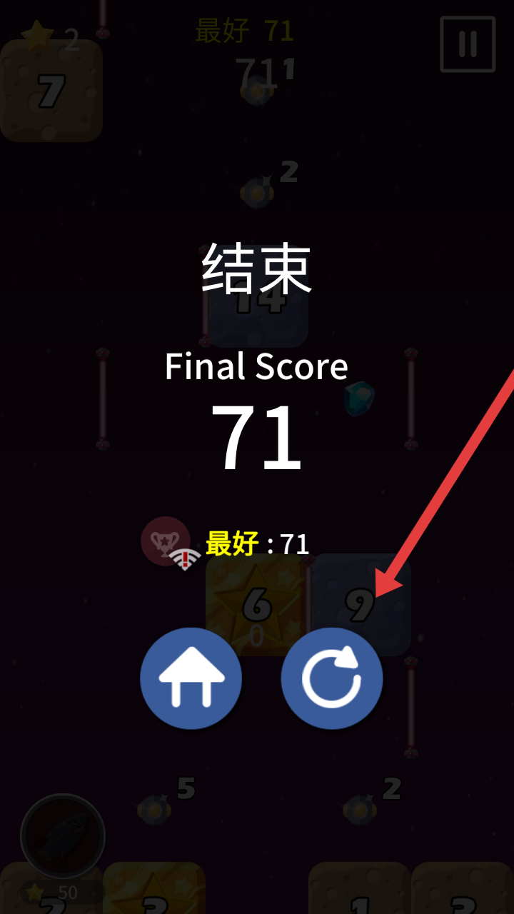 1、在游戏结束后,点击界面右侧带旋转箭头的蓝色重置按钮,可重新开启挑战,突破当前71分的记录。