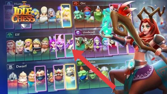2、进入棋子选择界面,按箭头指示,从“Elf”(精灵)等种族中挑选棋子,组建强力阵容,增强战力。